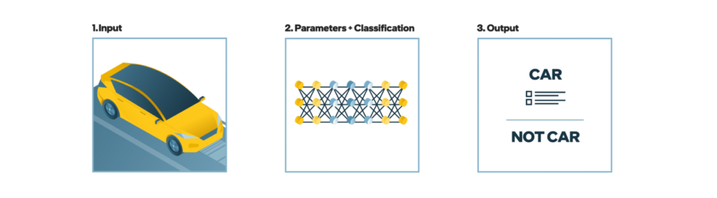 A type of mathematical model inspired by the human brain, neural networks take input (i.e., pictures of cars), pass it through neurons, or nodes within hidden layers of the network, to produce an output (a model of a “car”).